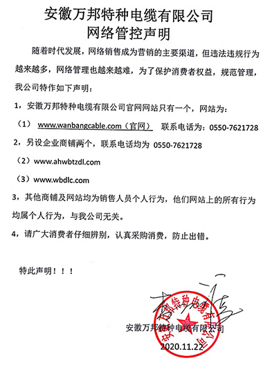 鄭重聲明:安徽萬邦特種電纜有限公司官方網站為:www_wanbangcable_com.goldenaxe.cn,除此之外無任何子網站或合作網站,其余均為假冒偽劣。電話:0550-7621728 13485756353 地 址:安徽省天長市滁州高新技術產業開發區經四路29號